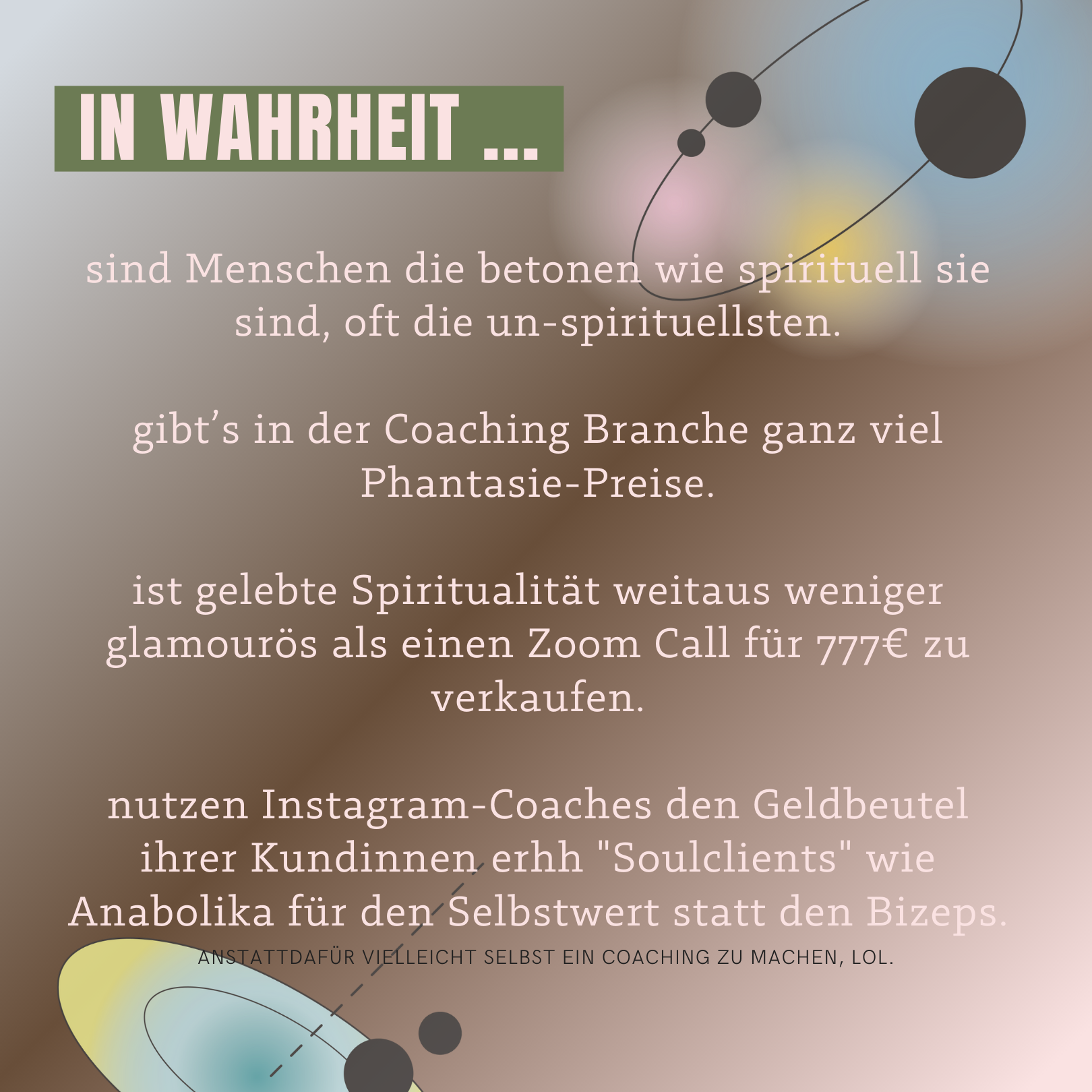 In Wahrheit sind Menschen die explizit und implizit betonen wie spirituell sie sind, oft die un-spirituellsten! Wenn du Leute sehen willst die Spiritualität NICHT leben, geh zu nem Yoga Festival. (Been there - Ich hab 1 Jahr für ein Healing Arts Festival gearbeitet)